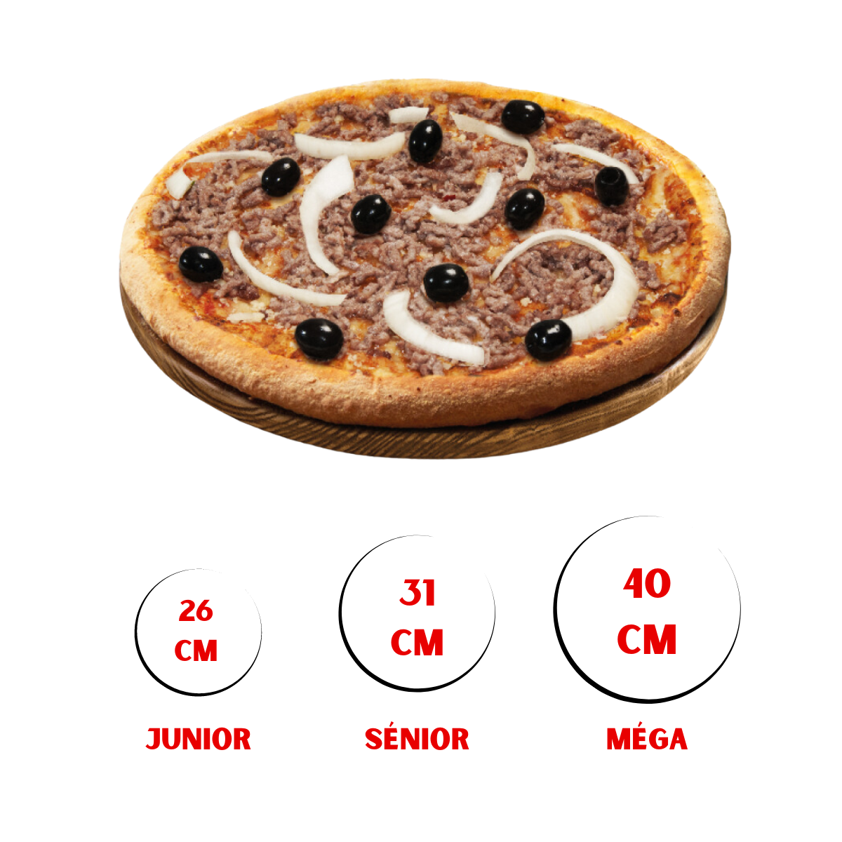 La « Pizza Kebab » est une option délicieusement garnie de tomate, fromage, kebab, viande hachée, oignons, olives, et origan. Cette pizza est disponible en trois tailles différentes : Junior (10,00€), Sénior (16,00€) et Méga (23,00€). Avec une combinaison de saveurs méditerranéennes, la « Pizza Kebab » offre une expérience gustative riche et copieuse. Elle est parfaite pour ceux qui aiment les pizzas aux ingrédients inspirés de la cuisine du Moyen-Orient, avec la saveur distinctive du kebab, les oignons, les olives, et l’arôme de l’origan.
