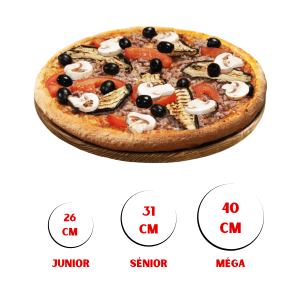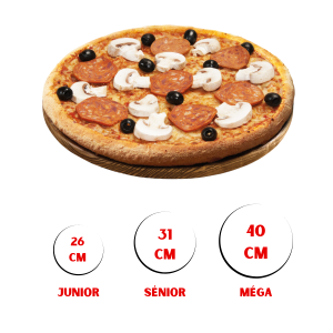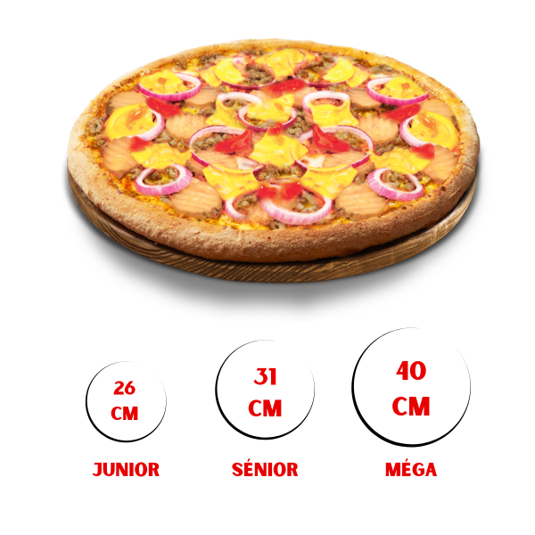 Découvrez la « Pizza Burger » avec son mariage parfait de sauce tomate, viande hachée, cheddar, oignons, cornichons et sauce ketchup. Choisissez parmi trois tailles : Junior (10,00€), Sénior (16,50€) et Méga (23,50€). Une explosion de saveurs qui offre une expérience gourmande en trois formats.