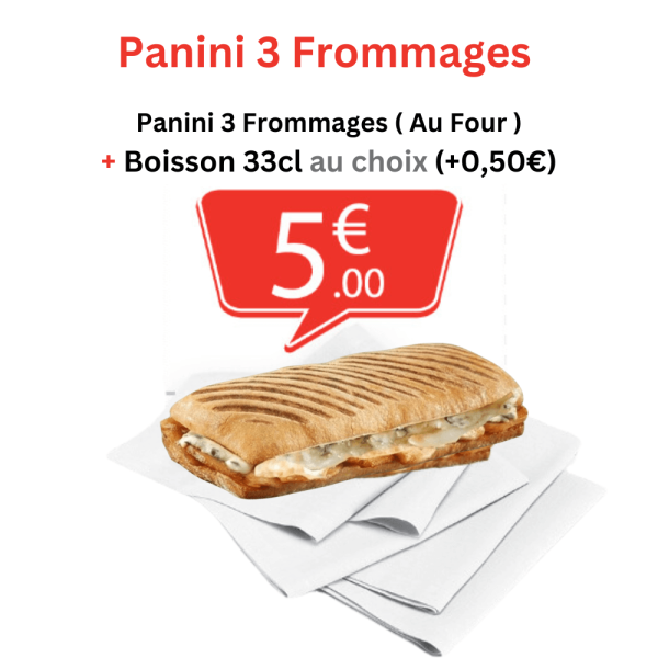 Ingrédients : Le trio irrésistible de fromage, chèvre et gorgonzola dans un panini, accompagné d’une boisson pour une expérience savoureuse et satisfaisante.