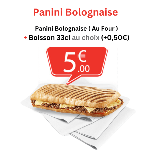 - Ingrédients : Le panini Bolognaise accompagné d’une boisson, créant une option savoureuse et désaltérante à un prix avantageux de 5,50 €. Profitez de cette combinaison pour une expérience gourmande et rafraîchissante.