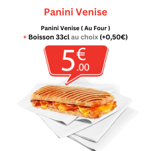- Ingrédients : Un délicieux panini composé de tomates fraîches, de fromage et de jambon*, offrant une combinaison classique et savoureuse.