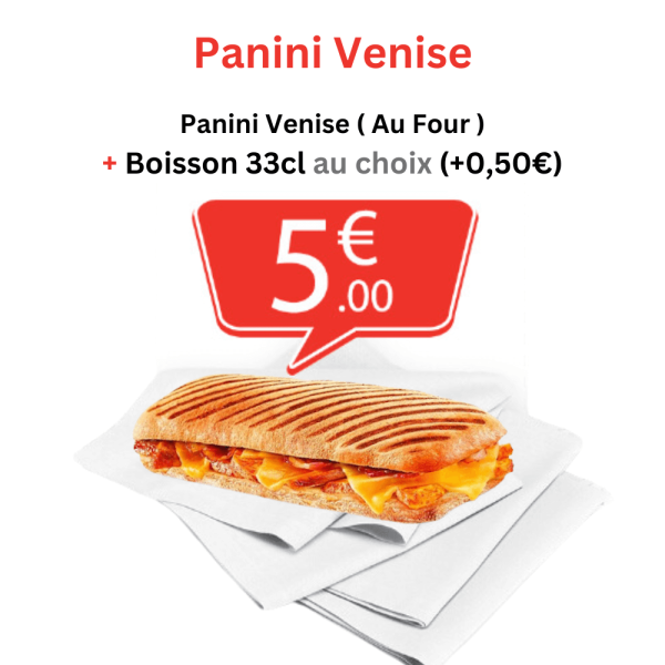 • Ingrédients : Le panini Venise accompagné d’une boisson, créant une option savoureuse et rafraîchissante à un prix avantageux de 5,50 €. Profitez de cette combinaison pour une expérience gourmande et désaltérante.