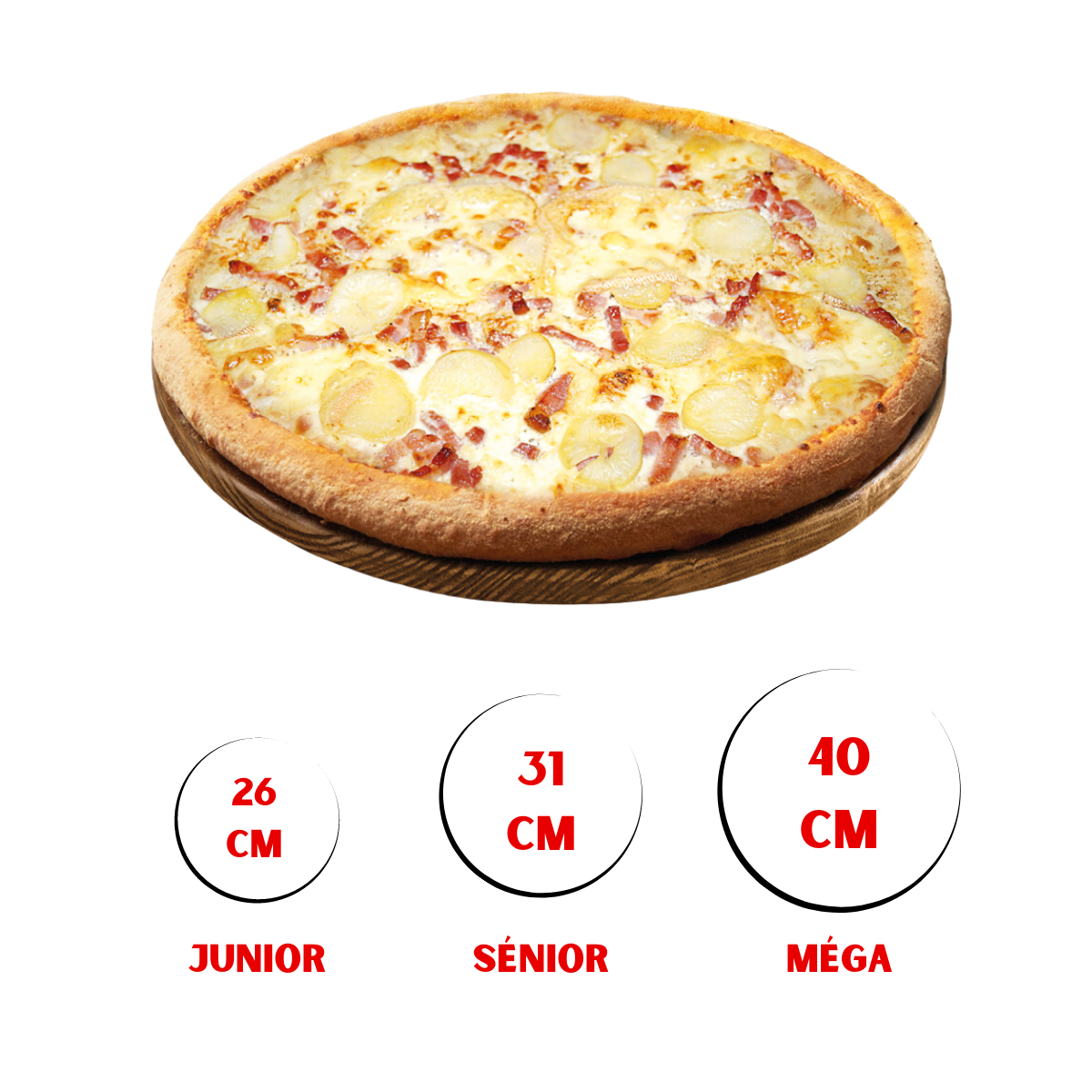 La « Pizza Tartiflette » est une délicieuse option qui propose une base de crème fraîche et de fromage, garnie de reblochon, de lardons , d’oignons, de pommes de terre et d’origan. Disponible en trois tailles différentes : Junior (10,00€), Sénior (16,00€) et Méga (23,00€), cette pizza offre une expérience gustative inspirée de la célèbre tartiflette. La combinaison de la crémeuse crème fraîche, du fromage fondant, du reblochon, des lardons, des oignons, des pommes de terre et de l’origan crée une pizza savoureuse, idéale pour ceux qui aiment les saveurs de montagne.